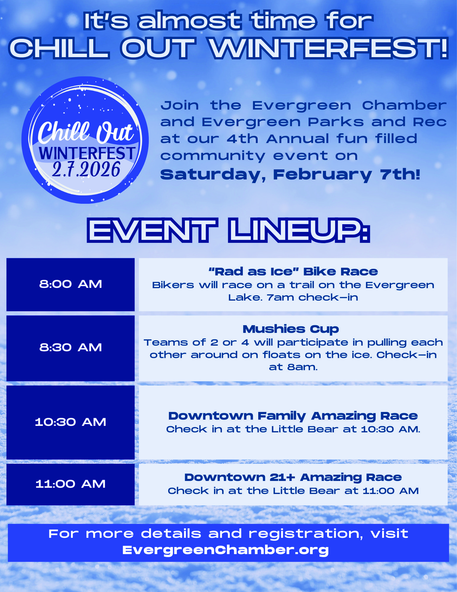 Chill Out Winterfest is our answer to the winter blues: a full day of playful competition, outdoor adventure, and community connection in the heart of Evergreen. Designed for families, friends, and anyone who needs a reason to get out of the house, Chill Out brings energy to the quietest season of the year while spotlighting the local businesses that make Evergreen special.